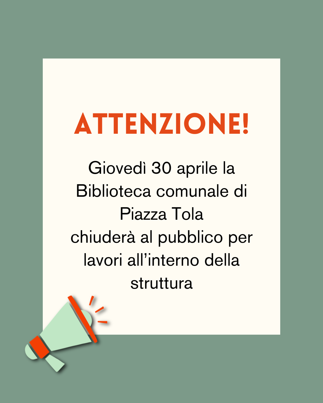 Giovedì 30 aprile la biblioteca comunale di piazza Tola sarà chiusa al pubblico per lavori all'interno della struttura.