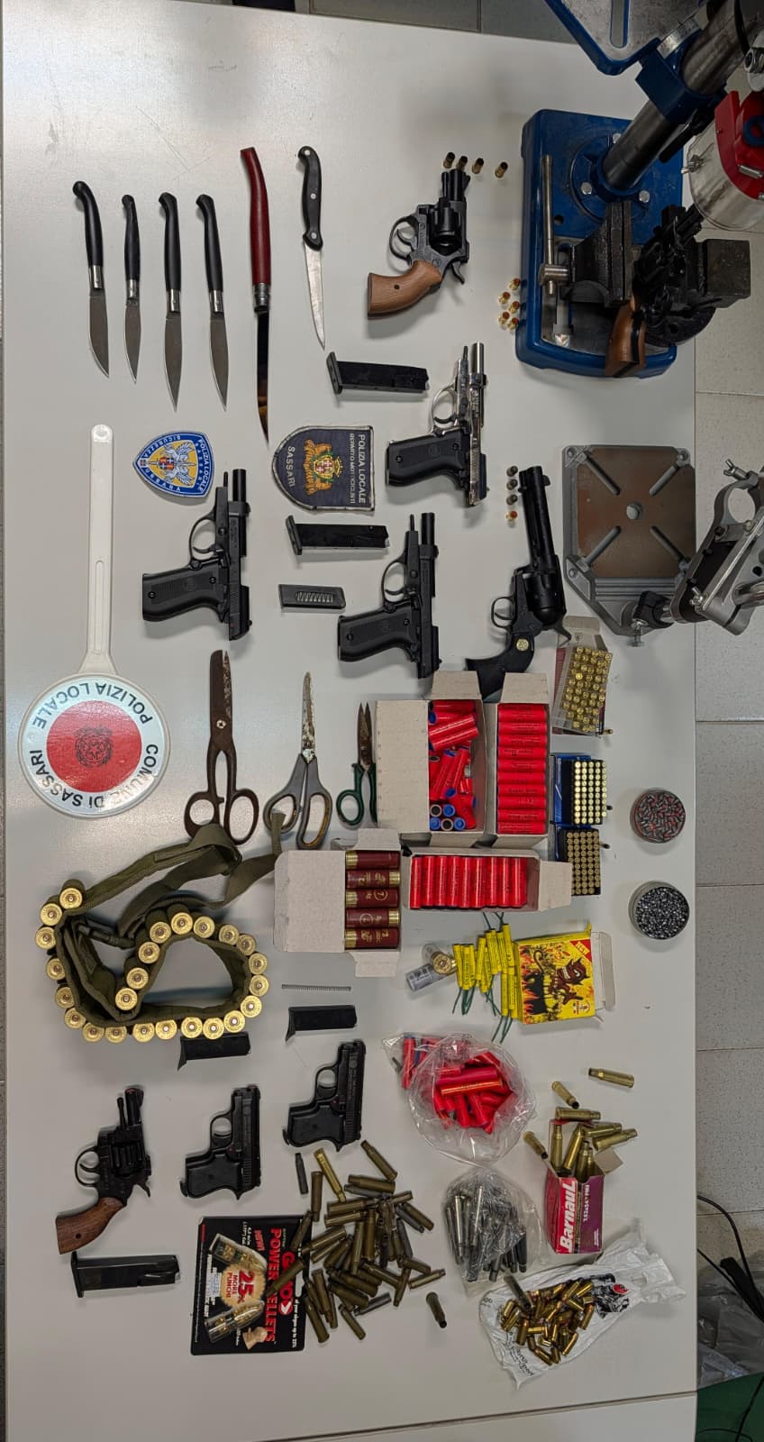 La successiva perquisizione domiciliare consentiva di rinvenire ulteriori armi, un tornio utilizzato per la modifica delle pistole scacciacani, una pressa per la ricarica delle cartucce impiegata per la fabbricazione di proiettili, numerose cartucce di diversi calibri e munizionamento rigenerato, e proiettili dei calibri .22, .40 S&W e calibro 12.
