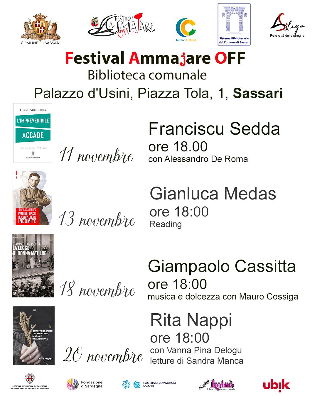 La biblioteca comunale di Sassari prosegue le attività di promozione culturale del territorio. Da martedì 11 novembre ospita quattro incontri con l’autore nell’ambito del programma “Ammajare Off”: un ciclo di appuntamenti che intreccia letteratura, memoria storica e riflessione contemporanea, legati ad “Ammajare” festival culturale che esplora i temi delle persecuzioni antiche e moderne. Tutti gli incontri si terranno alle 18 nella sala conferenze della biblioteca comunale di piazza Tola, con ingresso libero.